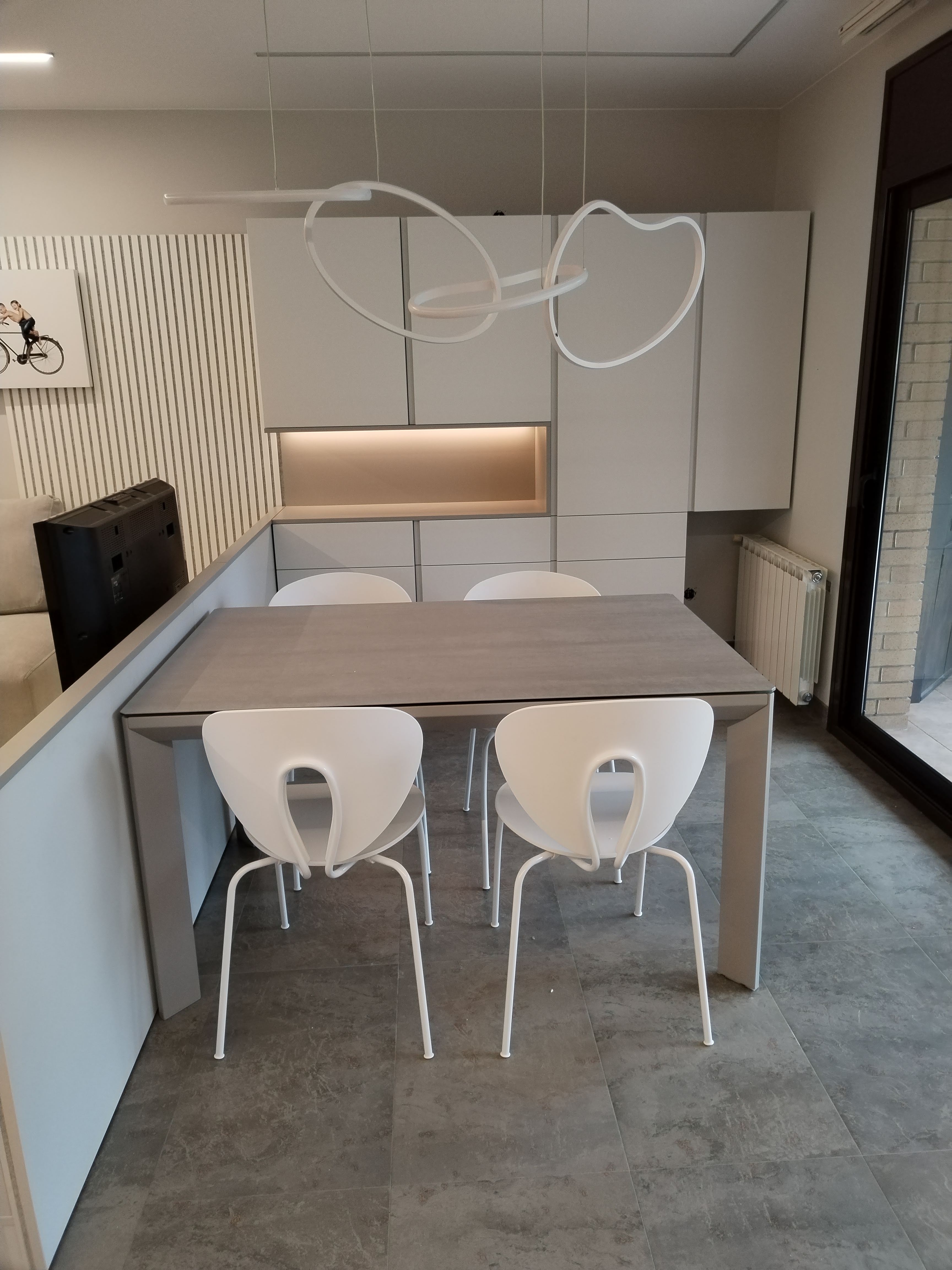 Menjador contemporani amb una distribució intel·ligent que separa els ambients sense perdre la connexió visual. La combinació de tons clars, mobiliari minimalista i il·luminació LED integrada crea un espai càlid, ampli i elegant. Un interiorisme equilibrat i actual, pensat per gaudir amb comoditat del dia a dia.